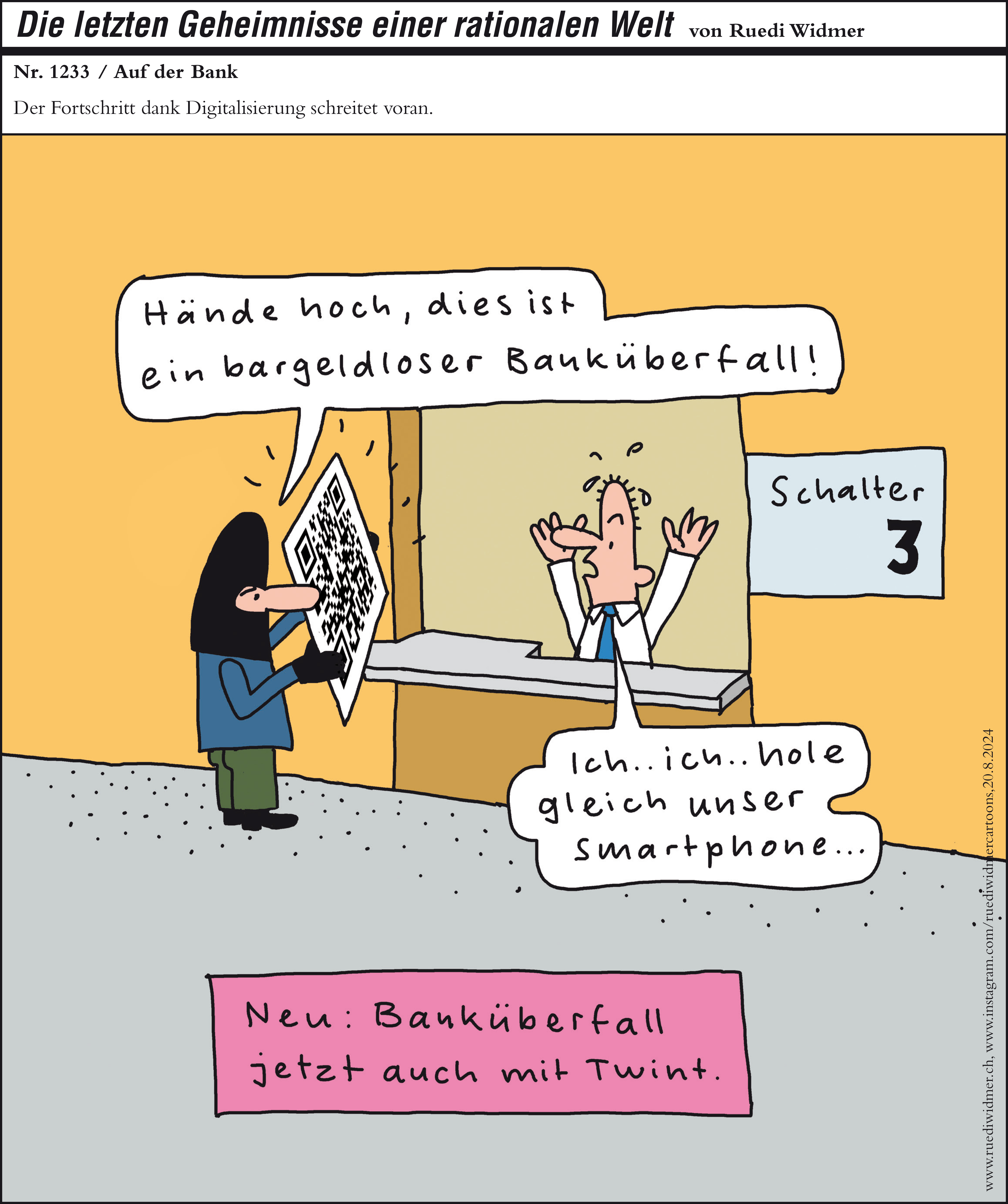 Auf den zweiten Platz hat die Jury des Swiss Cartoon Award ex aequo die Werke von Vincent Di Silvestro «Albert Rösti rouvre la porte du nucléaire» (Vigousse) und von Ruedi Widmer «Banküberfall» (Der Landbote) gewählt. Di Silvestro verbindet die Rückkehr der Atomenergie mit der Biodiversität. Widmer zeigt die Folgen der Digitalisierung mit einem bargeldlosen Banküberfall.